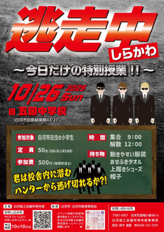タイトル:逃走中しらかわ~今日だけの特別授業~ 開催日時:2025年10月26日(日) 開催場所:旧五箇中学校 旧五箇中学校に“ハンター”を放出、制限時間内捕まらないように逃げ切れることは出来るのか⁉ ※開催内容の詳細は改めてお知らせ致します。 参加をご希望の方は、下記フォームよりお申込みください。 https://qr.paps.jp/WUXO6